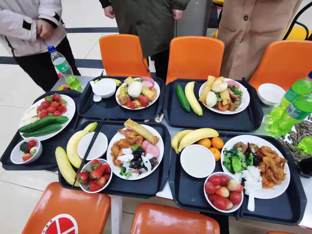 师生共迎虎福、并用家乡话送上新春寄语,大家在一片欢声笑语中共享盛宴、互送祝福。为了让同学们吃到可口的年夜饭,后勤厨师们制作了各类特色美食。