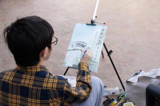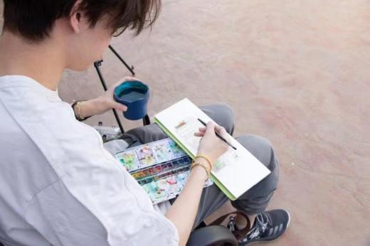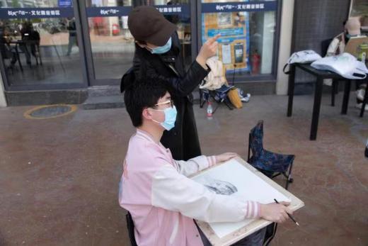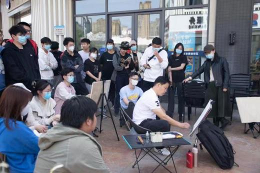 在领取画笔、画纸等绘图工具,工作人员发布活动具体要求后,参与活动的同学在赏金女王 渭水校区商业街自选视角进行绘画。本次活动发布后得到了同学们的积极响应,参与人数超200人,特别邀请杨毅柳、关宇老师进行现场指导。