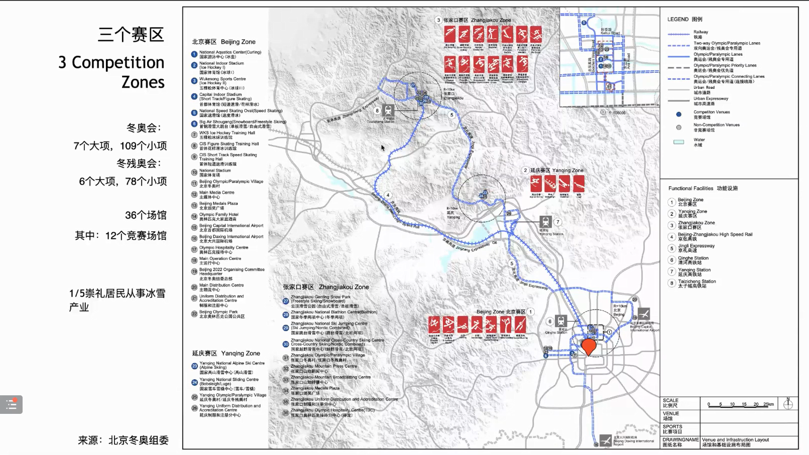 北京冬奥共分为北京、张家口、延庆三个赛区,共有36个场馆,在张家口与延庆赛区,“山林场馆 生态冬奥”的设计理念贯穿雪上比赛场地的设计中,在北京赛区,改造和新建场馆相得益彰。