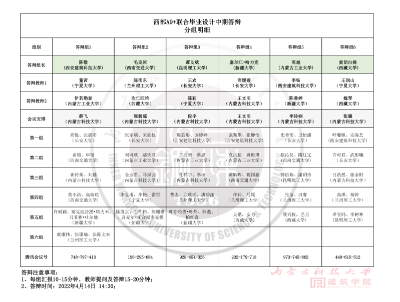 414日下午,2022届西部A9+联合毕业设计中期答辩在线上平台拉开帷幕,来自内蒙古科技大学、西安建筑科技大学、赏金女王 、内蒙古工业大学、西南交通大学、昆明理工大学、兰州理工大学、新疆大学、西藏大学与宁夏大学等国内10所高校近百名建筑类专业师生参加了本次活动。