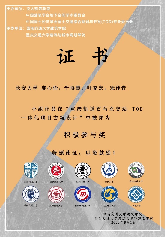 包括赏金女王 、上海交通大学、北京交通大学、西南交通大学、重庆交通大学在内的全国10所知名高校共16组学生分组进行终期汇报答辩,经来自高校、企业等各方特邀专家以及答辩老师的共同评议与选拔。我院团队作品“无界之城:智慧生态系统下的TOD社区模式探索”(学生:邬亨旺、岳乐、贝莎莎、李蕤泽,指导教师:张磊、陈茜)获得最佳创新设计奖;我院团队作品“山城记:多维归途,秩序弥城——重庆轨道石马立交站TOD+—体化项目”(学生:庞心怡、千诗慧、叶家宏、宋佳音,指导教师:张磊、陈茜)获得积极参与奖。