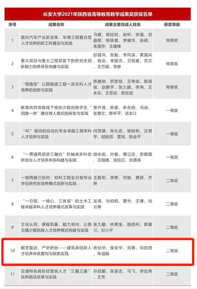 教学研究成果“数字驱动、产学研创——建筑类创新人才培养体系重构与探索实践”获2021年陕西省高等教育教学成果奖二等奖1项。