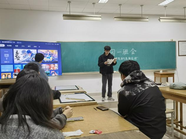 会议伊始,播放征兵宣传片,同学们一同观看视频,不时为祖国的军队建设取得的成绩所感叹与自豪。视频播放结束后,吴剑同学发表征兵宣传观后感,从国家安全到个人能力提升,并且以身边同学参军入伍的事迹为大家介绍国家对于军人的福利待遇,号召有志青年积极应征入伍。