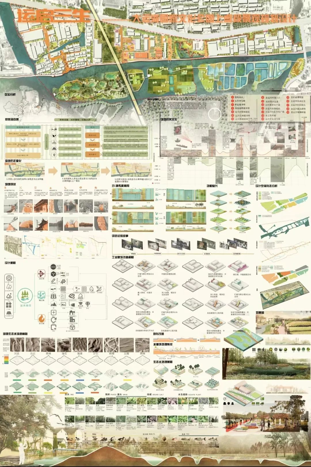 场地位于浙东古运河上虞段,是大运河国家公园体系的构成成部分,承担着传承保护运河文化遗产,提升运河生态环境,改善居民生活质量,带动区域经济文化发展,融入大运河国家公园体系等多重任务。本次设计提出“三境三生”策略,即“古运之境”——通过保护运河纤道 提升运河古村落,展现古运风貌;“湿生之境”——通过扩大现有湿地,增加净化水系统改善运河自然环境;“活力之境”,通过规划多元共享可持续的文创科教一体的古运新空间,释放场地活力,助力升级联动区域或产业,提升当地居民生活品质;运启三生,打造运河文化名片。