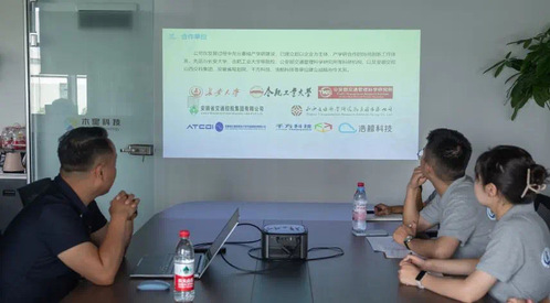 接着,一行人来到会议室,郭栋梁就公司业务简介、主要项目成就、成品模型展示三个方面详细地介绍了安徽木星技公司的基本情况,并为实践团队成员展示行业现状和科技手段的现实应用。提及创业的波折经历,郭栋梁以师兄的身份告诫实践团队成员对于自主创业要尽量避免少年意气的一时冲动,既要深思熟虑又要敢想敢为。不管是否选择创业,最重要的就是在沉淀好基础知识的同时做好自己未来的人生规划。同时,在以后就业单位中也要积极寻求前辈帮助,借助“传帮带”的形式努力提升自我能力,从而有效且快速地度过就业“平滑期”。