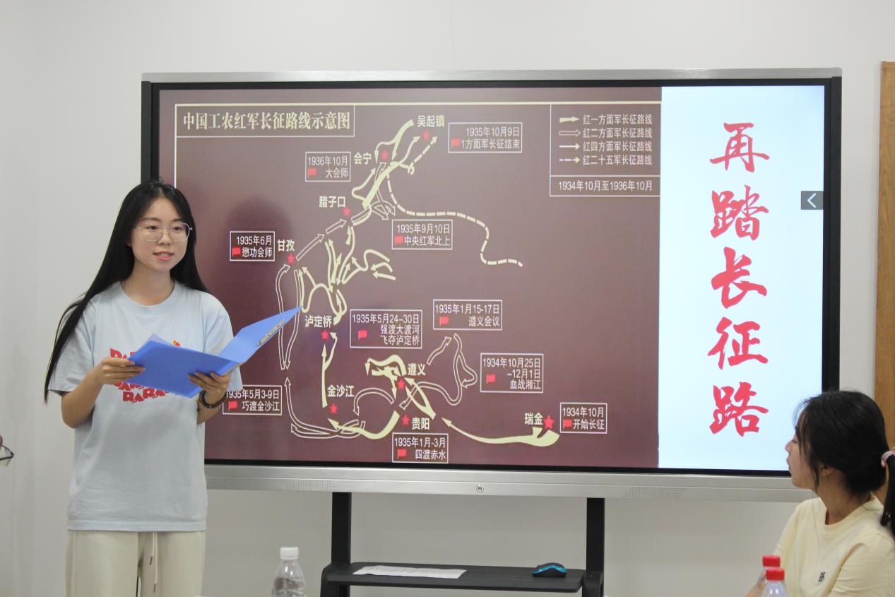 而后,本科生第四党支部的党员们走上前,在长征地图上带领大家重温长征之路。一段“再踏长征路”沙盘演绎诉尽沿途艰险多难,再现红军英勇刚毅的光辉形象。这也让大家深刻领会了长征精神,激发赤子之心。