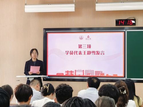 培训班学员代表王静雪发言。她回顾了在党校培训班学习三个月所取得的收获,并表达对党组织的憧憬和入党的决心。未来,她希望可以继续在实践中提升自我,砥砺奋进,力争上游。