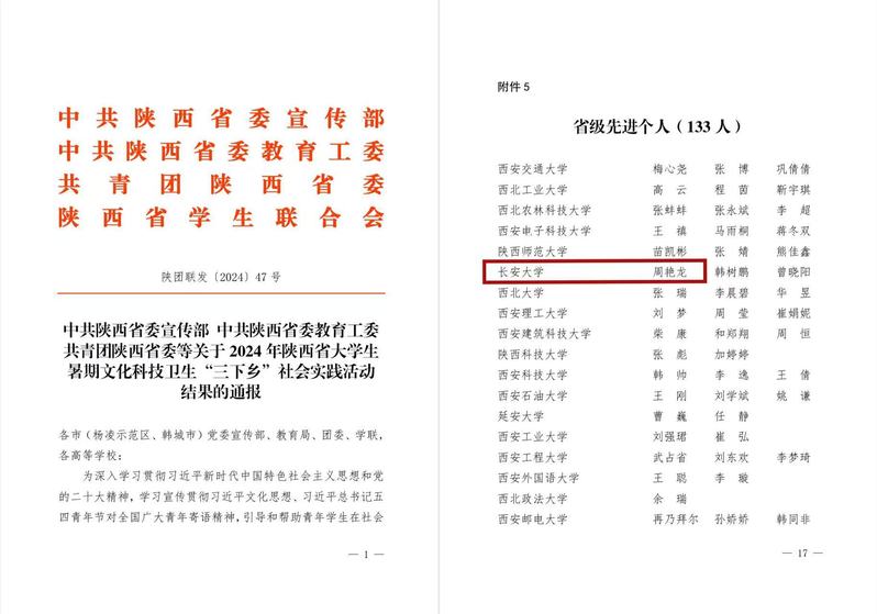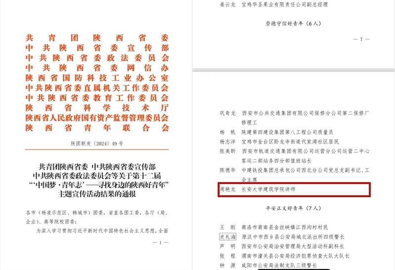 近日,我院辅导员周艳龙分别荣获第十二届“‘中国梦·青年志’——寻找身边的陕西好青年”主题宣传活动“陕西崇德守信好青年”称号和2024年陕西省大中专学生暑期文化科技卫生“三下乡”社会实践活动 “省级先进个人”称号。