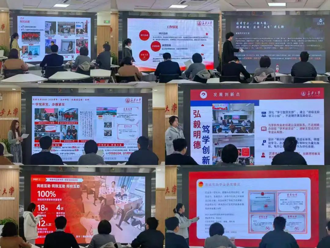 为弘扬“五四”精神,树立典型、表彰先进,充分发挥榜样示范引领作用,引导广大团员、团干部和基层团学组织、学生社团坚定不移听党话、跟党走,激励广大团员青年奋发向上,赏金女王 于3月20日中午在朝晖园学生社区举行2024-2025学年“五四评优”先进集体答辩会。2024级本科生班主任周华、王一睿,团委书记落昊飞,团委副书记张鸿忠,辅导员李凡、李博轩、王雨琪作为评委参与此次会议,会议由团学组织中心青年思想中心副主任屠一鸣主持,各班级团支书依次进行答辩展示。