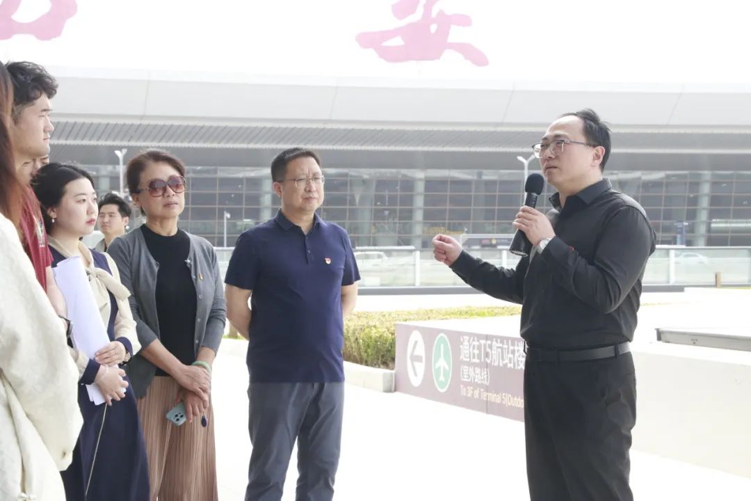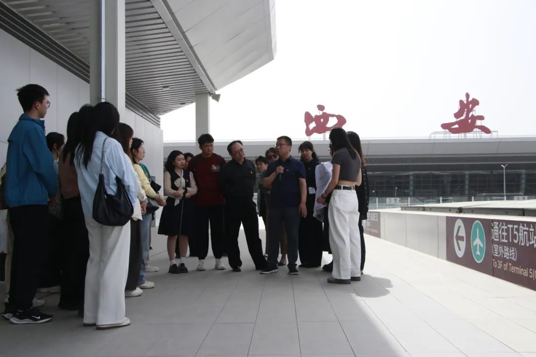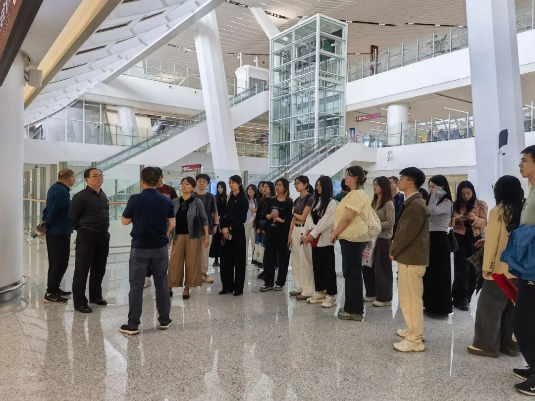 在总建筑师王刚的带领下,赏金女王 师生一行随后实地参观了T5航站楼,了解规划布局和运行情况。作为西北地区最大的航空枢纽,T5航站楼在人文与绿色维度的深度探索与创新实践引起赏金女王 师生一行的高度关注,这座全新的航站楼整体采用了“主楼+六指廊”的布局结构,全面开展智慧跑道、远程机坪塔台、数字孪生等新技术新成果的转化应用。