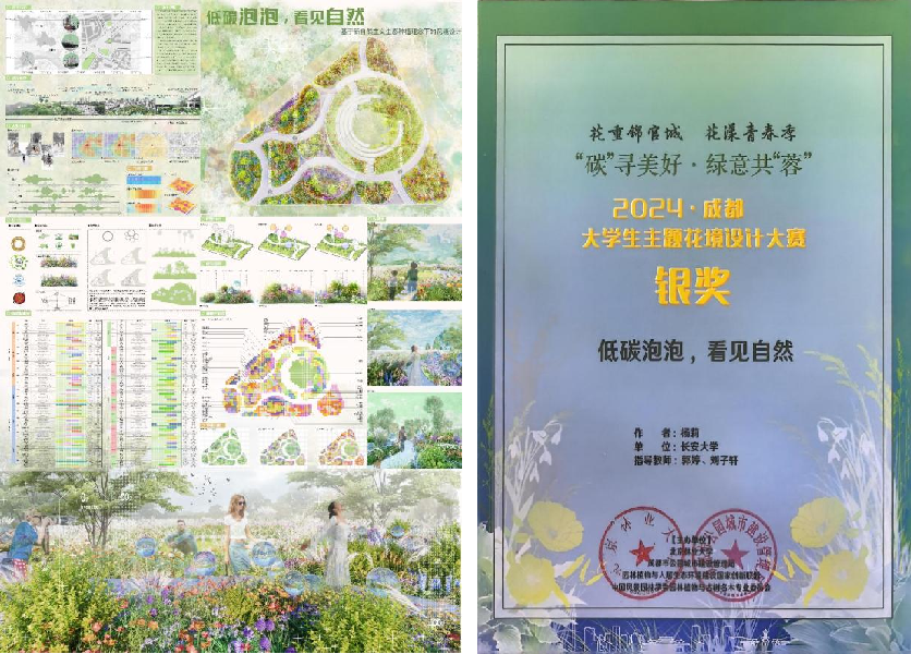自2024年6月1日发布大赛方案征集公告以来,受到了全国各地高校的广泛关注, 295组作品进入初评阶段,覆盖全国89所院校。经过初筛、个人函评、小组会评和小组复评4轮次筛选,40余份作品入围进入终评环节。经专家组多轮投票评选,我院风景园林系教师刘子轩、郭婷带领并指导的2023级研究生杨莉获得大赛银奖并在天府公园落地建造。