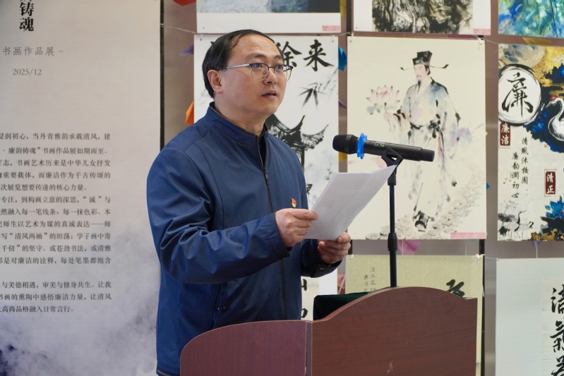 贾侃在致辞中进一步阐释活动内涵。他指出,本次作品展既是学院落实新时代廉洁文化建设要求的生动实践,也是学校深化立德树人根本任务、涵养风清气正校园生态的重要举措。他希望全体师生以学育廉筑牢思想根基,以文化人涵养清廉风尚,以行践廉担当时代重任,将廉洁理念融入学习、工作与未来职业发展全过程。