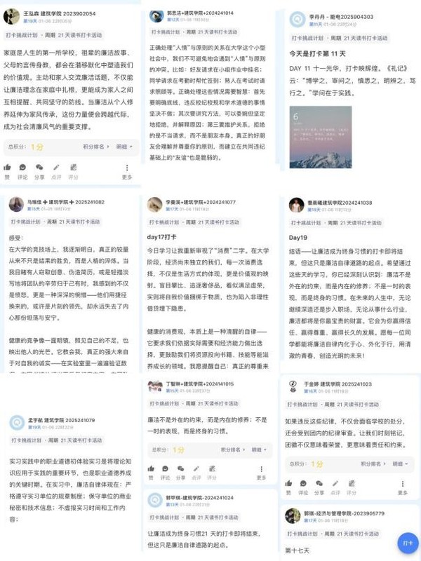 活动依托微信小程序开展,学生每日登录专区学习廉洁故事、纪律条例及考风考纪等材料,轻量化设计实现常态化浸润。打卡过程中,学生逐步养成“每日一学”习惯,廉洁与诚信观念扎根入心。其中201名学生连续打卡天数过半,展现出良好自律性与学风素养。